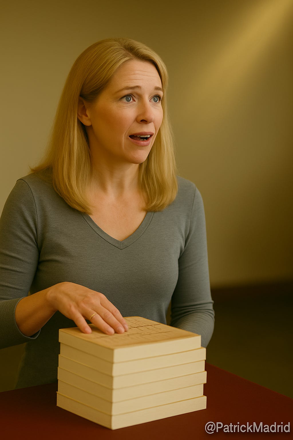 One day, she explained, a Catholic classmate walked into class carrying a box of books (44 copies of Surprised by Truth, don’t ya know) and handed out copies to everyone, including the professor. She admitted she was more amused than anything else.