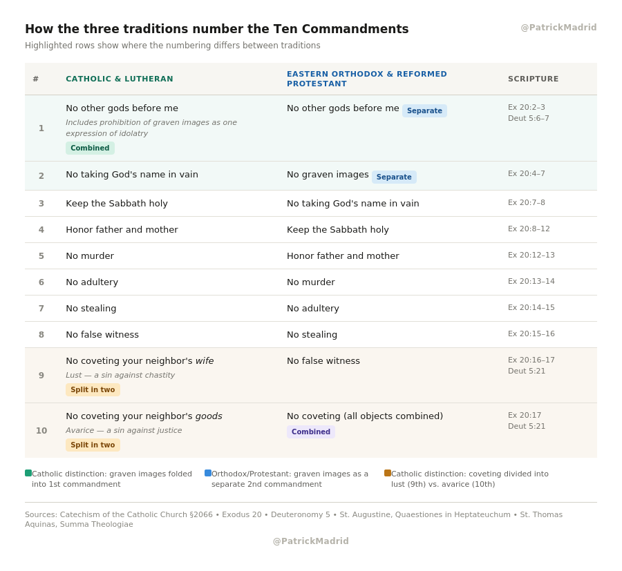 The biblical text itself varies the order (wife first in Deuteronomy, property first in Exodus), and the Catholic numbering convention respects that important nuance. These variations are catechetical rather than doctrinal. Rabbinic convention emphasizes the ban on graven images as the Second Commandment (see “The Ten Commandments” article at My Jewish Learning).