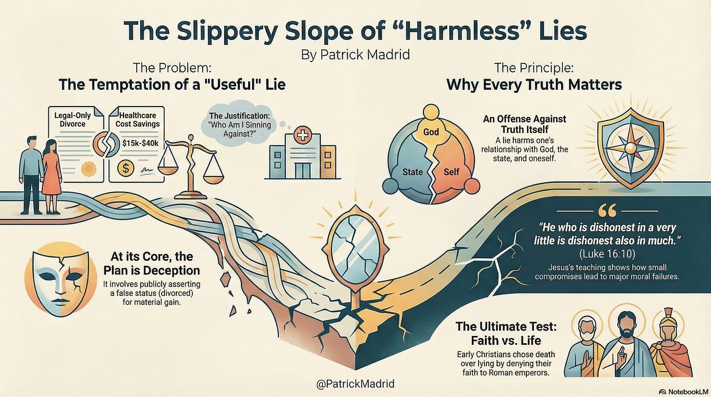 At the heart of this stratagem lies deception. One would be claiming a civil status that does not exist in reality and doing so for material gain. Catholic moral teaching treats truth as sacred because truth reflects God’s own nature. To manipulate the truth for personal advantage violates the conscience before it violates anything else. Lying is a sin. Or as God put it it: